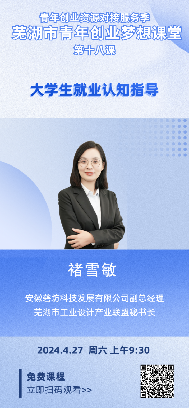 4月27日上午,“源來好創(chuàng)業(yè)”青年創(chuàng)業(yè)資源對接服務(wù)季——蕪湖市青年創(chuàng)業(yè)夢想課堂第十八課正式播出。本次是由安徽礱坊科技發(fā)展有限公司副總經(jīng)理,蕪湖市工業(yè)設(shè)計產(chǎn)業(yè)聯(lián)盟秘書長褚雪敏帶來的《大學(xué)生就業(yè)認(rèn)知指導(dǎo)》課程。